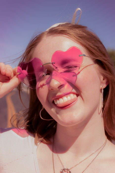 This photoshoot took inspiration from the idiom looking at the world through rose colored glasses. Having a pair of rose colored glasses that are a key prop in the images, as well as a pink tint to really show that idea. As well as making all of the images bright and happy feeling, giving them a sort of optomistic look on life feel. The goal is to show life through the eyes of the girl with the rose colored glasses, it is all portrayed in a bright and happy way as if there is no wrong in the world.